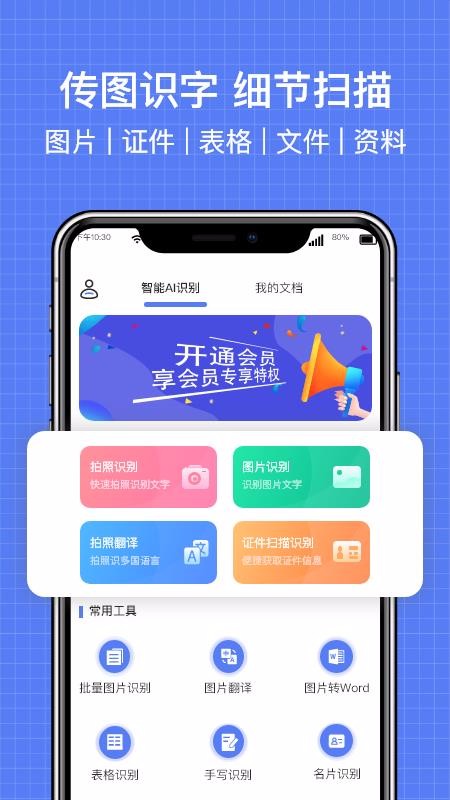 4、清晰美观的常用功能,主页展示证件扫描识别、图片识别等快捷工具和美观的颜色标签;