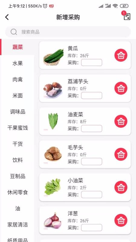 5、拥有丰富的采购新增商品类别列表,其中涵盖蔬菜、水果以及调味品等类别;