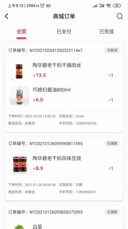 6、一目了然的商城订单状态,商城订单中展示不同状态订单栏,还展示已取消、已退款等状态标签;