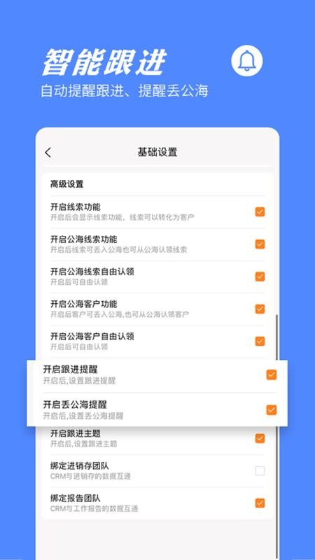 5、设置自动提供跟进信息,可以按开启线索、客户等自由认领的功能,营销管理非常简单;