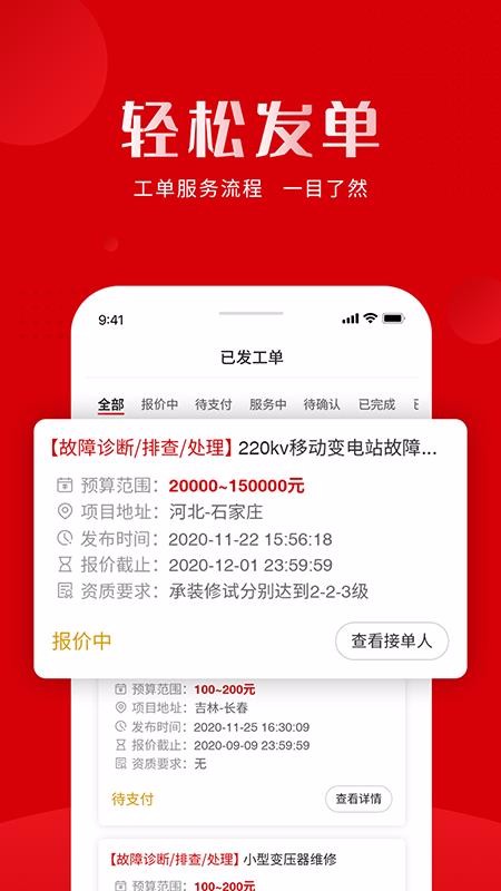 1、自动保存已发工单的信息,并按照报价中、待支付、服务中、待确认等分类进行展示;