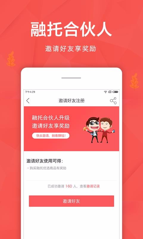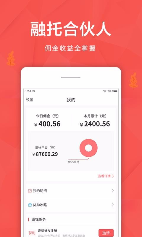 融托合伙人app是一款简单方便的业务处理软件,让运动办公变得更简单,提高办公的效率,办公变得更随意;你先在线发布邀请信息,并快速邀请用户,提高推广的效率,拥有更多的客户,提高推广的质量,邀请完成后将新客户统一管理,知道客户的需求,满足客户的需求,服务更贴心;推广完成后在线处理客户的信息,知道客户的情况,给客户满意的服务,维护客户关系更方便;最后将个人邀请、分享和奖励数据进行统计,知道个人的收益情况,收益数据更真实,便于管理让移动办公变得更方便,维护客户关系更专业,赚钱简单方便。