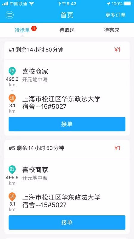 喜校专送是专门为配送员提供的接单和配送平台,而且只要用户登录该平台后,就可以通过手机进行接单,相应的系统会根据定位功能,自动推送附近的新订单,让配送员轻松接到距离近的订单,因此,想要体验便捷接单的用户,就可以下载该软件进行使用;配送员在该平台中接单之后,就可以获得平台提供的订单信息,及时了解订单的实时配送信息和进度,也确保配送员准确和快速送货;相应的平台也提供了其他送货保障,比如语音提醒、路线导航、在线客服、异常提醒等,全方位帮助配送员快速完成订单配送服务,并提高用户的配送体验。
