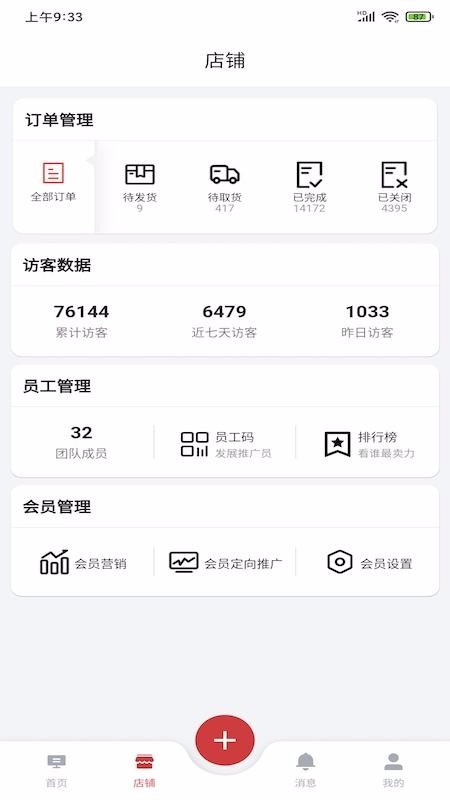 5、便捷清晰的店铺管理功能划分,店铺中心划分了订单并管理、访客管理以及员工和会员管理栏;
