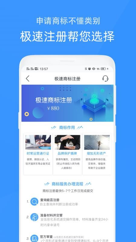 2、为用户提供了极速商标注册模块,能以更短的时间,拿到商标;