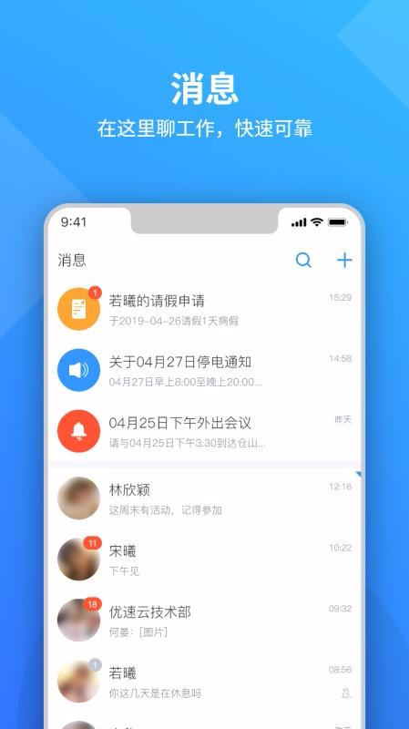 优速云是一个智能移动办公平台,帮助企业实现在线办公,相应的提供的办公功能多样,比如消息沟通、移动考勤、移动审批、任务分配、周报等,类型多,形式也丰富,可以让企业在线更好的进行协同办公;所以用户只要将该软件下载在手机中,就可以搜索企业组织进行加入,并便捷的获得企业发布的通知公告;相应的该软件也提供了PC端,用户也可以在电脑端使用该软件,登录同一个账号后,所有数据和信息同步展示,也满足了多样化的使用场景;因此,想要便捷办公和通讯的用户,就可以通过该软件进行实现,而移动办公更加便捷。