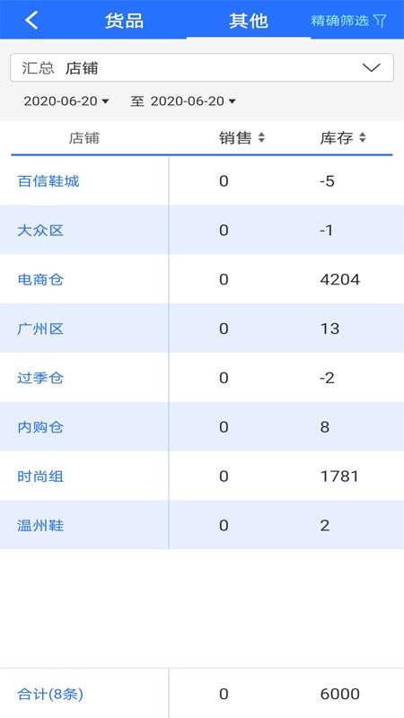 4、进入货品版块,查看不同货品的销量和库存量信息,了解汇总情况