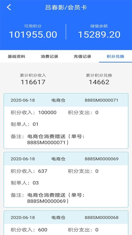 5、打开会员资料版块,查看会员的累计消费和积分情况,了解积分兑换动态