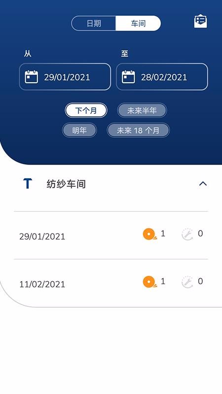 5、快捷的车间保养维护计划查询标签,这里设置了下个月、未来半年以及明年等标签;