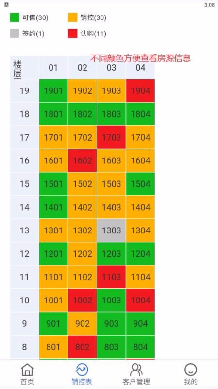 1、多种不同的销控表颜色划分,其中有可售状态、销控状态以及认购等不同颜色状态;