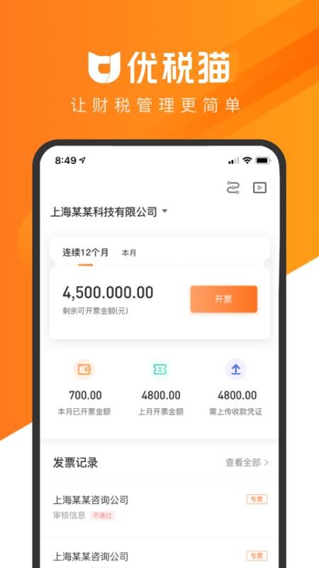 优税猫app是一款专业的税务管理软件,它可以帮助企业以及高收入人群解决各种税务难题,让用户能轻轻松松的进行税务管理,提高用户的管理效率,非常的具有实用性;在这里,将用户的剩余可开票金额直观的展示在应用上,可快速的进行查看,了解相关信息,并可快速的填写申请开票公司、纳税人、发票类型等信息,轻松的进行在线开票,让开票变得更加的简单;同时,将用户的开票情况进行了记录,可随时查看自己的开票历史,让用户可以更加快速的对账,不会漏掉任何一个关键的开票信息,十分的方便;感兴趣的小伙伴抓紧时间下载使用吧。