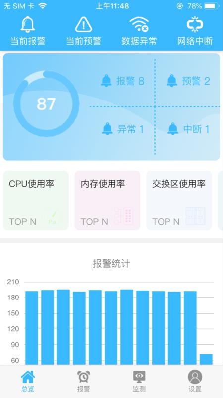 2、在首页中查看不同类型的报警和异常等信息数量,了解报警统计内容