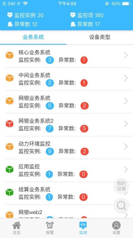 4、进入监测版块,查看各个业务系统的监控实例和异常数量信息,快速处理异常