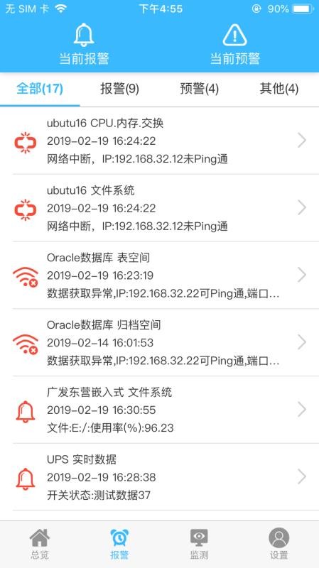 4、应用中有详细报警和异常分类,分为当前报警、当前预警、数据异常和网络中断四个版块;