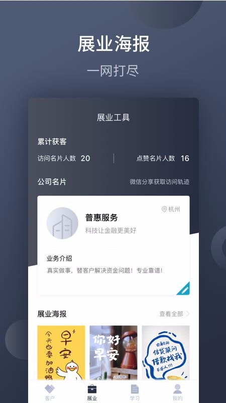 展业引擎是一款专注于信贷展业的应用,为用户提供客源智能匹配功能,还整合并提供非常优质且丰富的展业海报素材;软件主功能栏开设了客户、展业以及学习中心,从基础学习到营销推广,再到精准客源获取环节都为用户提供了相应的服务和功能,不会营销的用户能从学习专区找到简单易学的各种课程内容,轻松学会基础营销技巧,还有各种进阶技巧课程为你提升销售技能;另外还设置精准的客户匹配雷达中心,学会销售推广技能并宣传推广后,就能高效获取精准的引流客户资源,同时还设置各种便捷的客户管理和沟通工具,有效地提高信贷成交率。