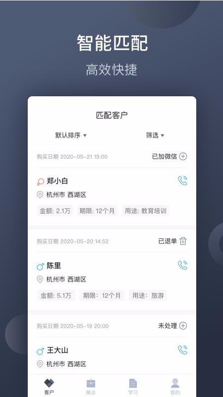 1、马上拨打客户电话,在匹配客户页面选择其中一个客户就能立即拨打电话;