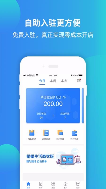 蜗蜗生活商家是一款商家管理app,针对家政服务端设计主要功能涵盖订单管理、收入管理以及店铺管理等多种管理;它为用户开设了免费入驻到平台的渠道,不用任何的加盟费用就能轻松入驻到该平台,入驻成功后就能自由使用里面的各种管理工具,实现了零成本开店的操作,同时还为用户贴心的设置了智能营收数据核算系统,不用商家自己计算就能快速掌握每天的营收数据情况,给商家带来了更多的店铺管理便利;这里有一站式的各种商品服务管理和订单管理模式,拥有高效的服务编辑管理专区,随时随地都能自由发布新服务,更有移动式的接单中心,自由接单无压力。