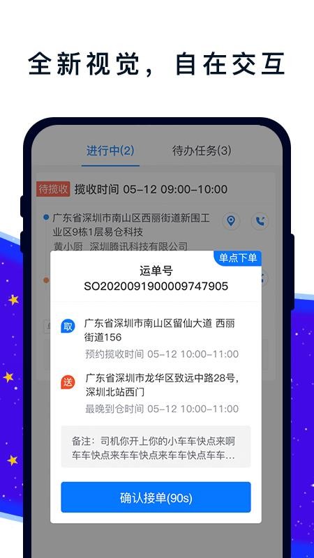 4、一键接单,一键就可以接取到对应的运输订单,轻松即可接单;