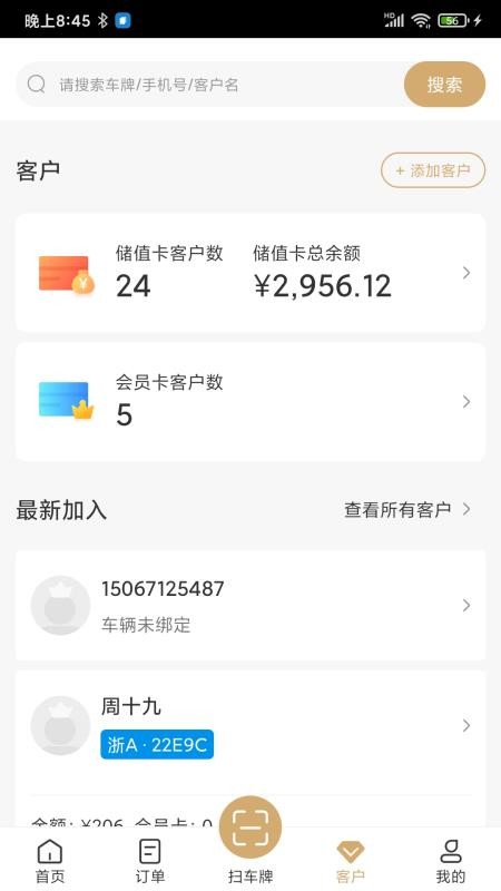 4、进入客户版块,查看自己店铺的客户数量和储值卡总金额信息,了解各客户车辆详情