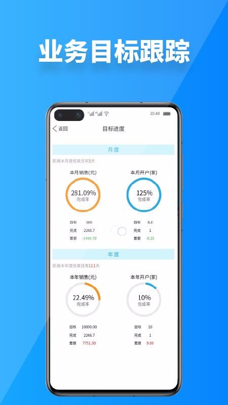 1、一目了然的目标进度状态,里面采用环状统计图展示了相应的目标进度状态;