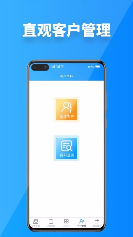 5、简单快捷的客户资料管理中心,这里设置了新建客户和资料查询两个快捷功能图标;
