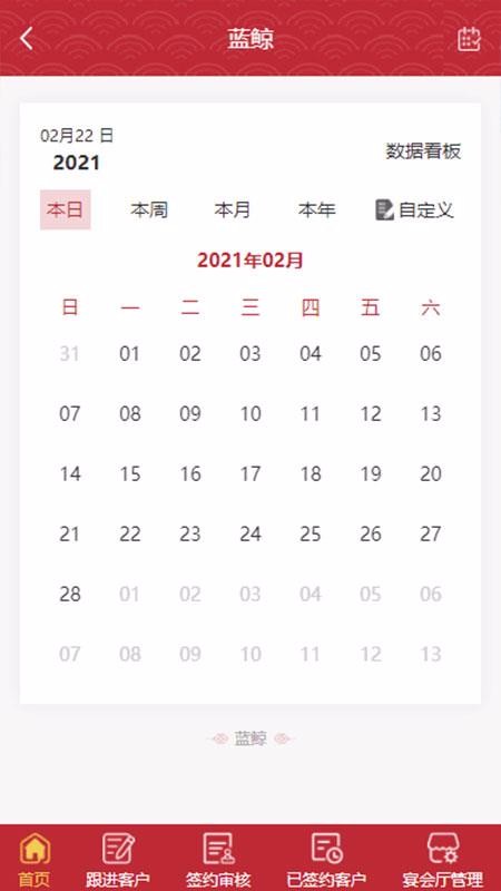 3、丰富的宴会管理功能中心,在宴会管理页面设置了日程、跟进客户、签约审核以及宴会厅管理等中心;