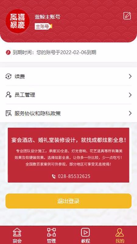 1、简单实用的个人中心,我的主页中设置了续费、员工管理以及服务协议和隐私政策等列表;