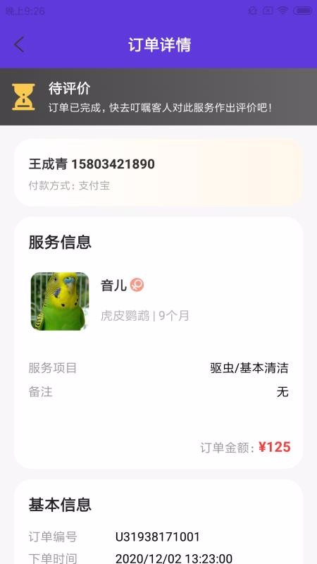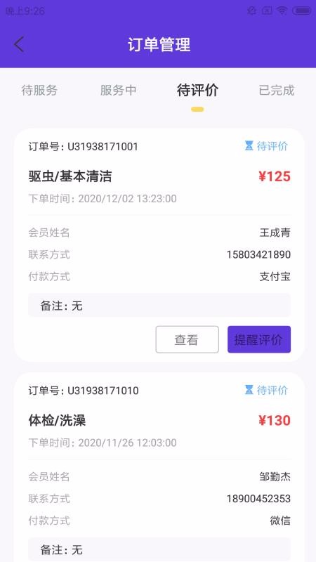 1、支持订单管理,分类浏览订单信息,包括待服务、服务中、待评价等分类;