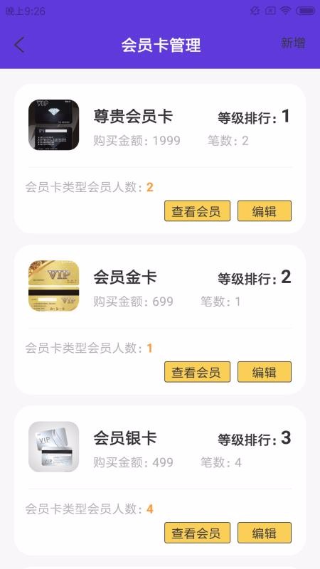 3、可以进行会员卡管理,自行新增会员卡,选择会员卡即可查看等级排行、消费数据等;