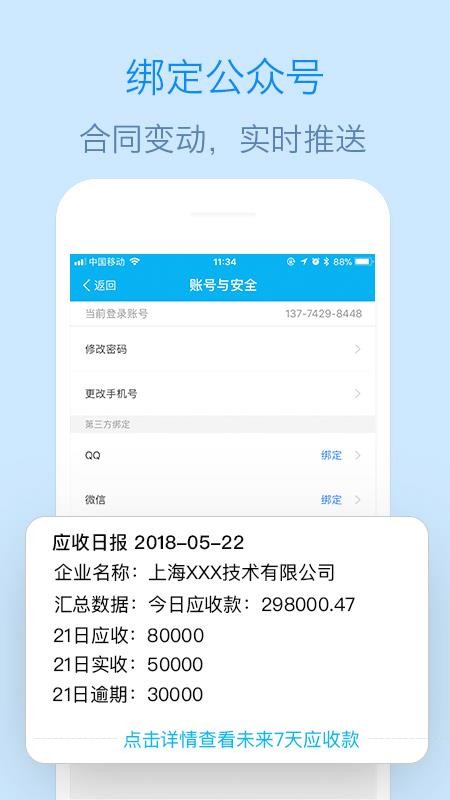 4、通知提醒,绑定微信后,可将合同的变化情况在微信上提醒用户;