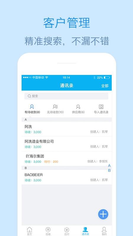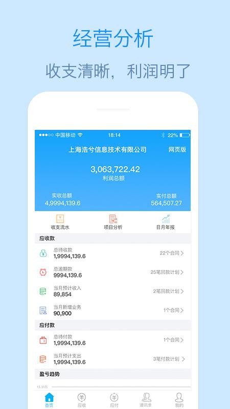 记应收app是一款办公类软件,它主要为用户提供企业的现金流管理服务,能让用户更加便捷的知晓企业的应收以及应付账款,帮助用户更好的进行理财,非常的具有实用性;在这里,详细的记录了企业的总待收款、总逾期款、当月预计收入、当月新增收入、待付款、当月预计支出等信息,并将它们直观的展现在用户的面前,用户可自由的进行查看,轻松就可以了解到企业的收支信息,让用户能根据出示的项目分析报告,清晰的获取到分析出来的数据信息,便于用户做出合适的管理操作,减轻用户的管理压力;如果有需要,就赶快下载体验一下吧。
