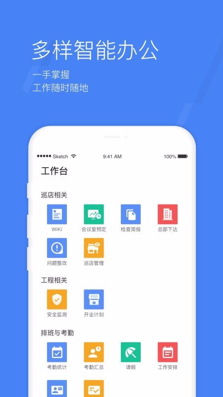 1、丰富的工作台应用划分栏,这里的功能划分成巡店相关、工程相关以及排班与考勤类应用;