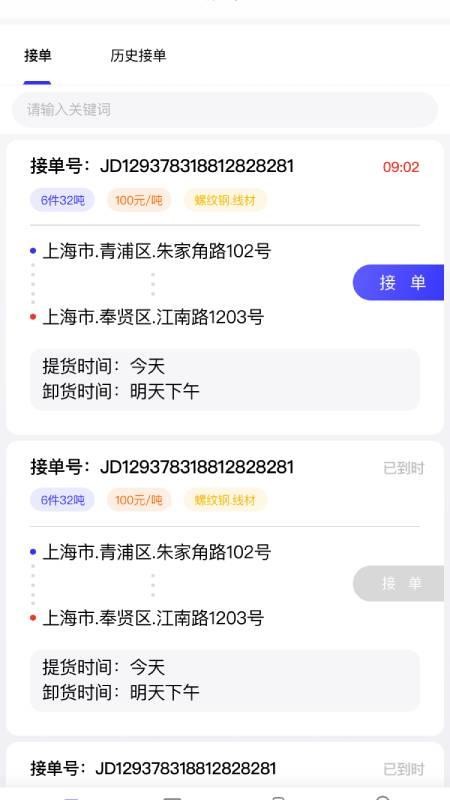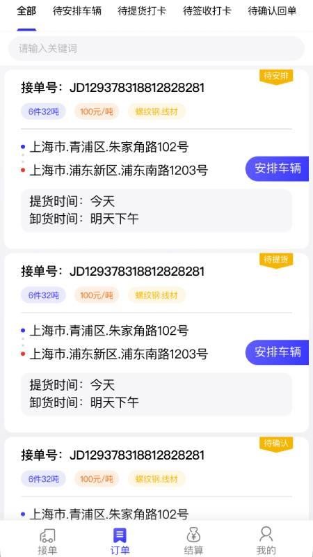 3、在这里,用户能够清晰看到各个订单的接单号、货物重量和起始地等信息;