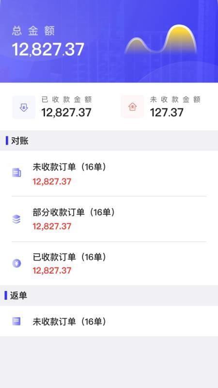 2、用户在软件中能够看到未收款订单、部分收款订单和已收款订单的笔数和金额信息;