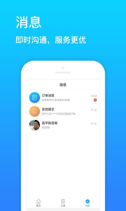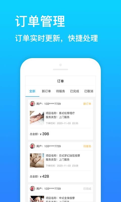 6、拥有详细的订单分类,分为新订单、待服务、已完成和已取消等,方便用户查看;