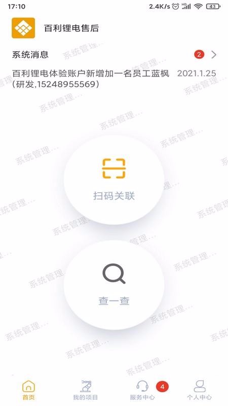 百利锂电售后app是专门为百利锂电售后工作人员提供的工作平台,相关工作人员可以登录该软件查看推送的报修、申请等消息,并与客户进行线上联系和沟通,全面保障客户的售后服务,也帮助该企业提升客户的品牌满意度;同时该软件提供了各种管理功能,比如扫码关联、项目管理、消息提醒等,让用户一站式管理售后服务,并且该系统功能使用简单,可以让工作人员快速上手操作,也解决了企业各种售后需求和问题;有需求的用户可以下载该软件进行使用,快速下载和安装在手机中后,可以让工作人员随时随地办公,并紧密联系客户。