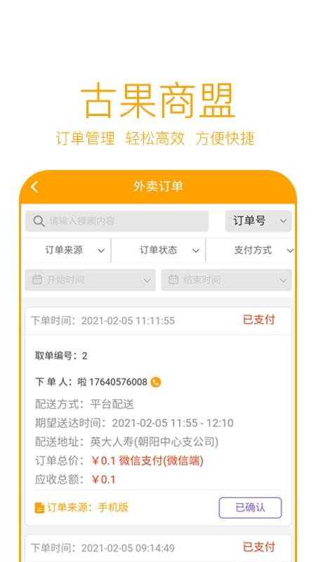 4、可以通过订单来源、订单状态和支付的方式来查询筛选订单,轻松查看订单的信息;