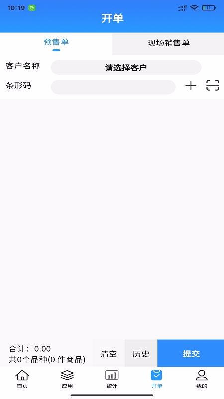 6、便捷的开单操作中心,开单页面为用户提供预售单和现场销售单开单栏目,还提供便捷的条形码输入方式;
