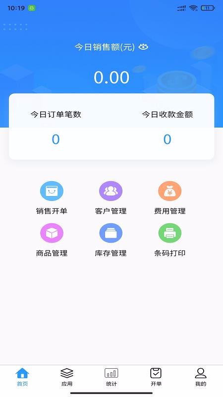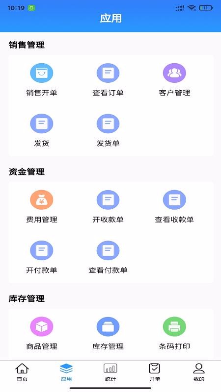 4、方便快捷的多个常见应用图标,另外还在首页设置开单、商品管理、费用管理以及条码打印等工具;