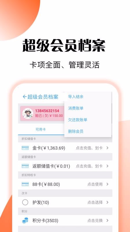 4、提供了会员档案,可以查看各会员信息,并进行导入结余、消费账单、删除会员等;