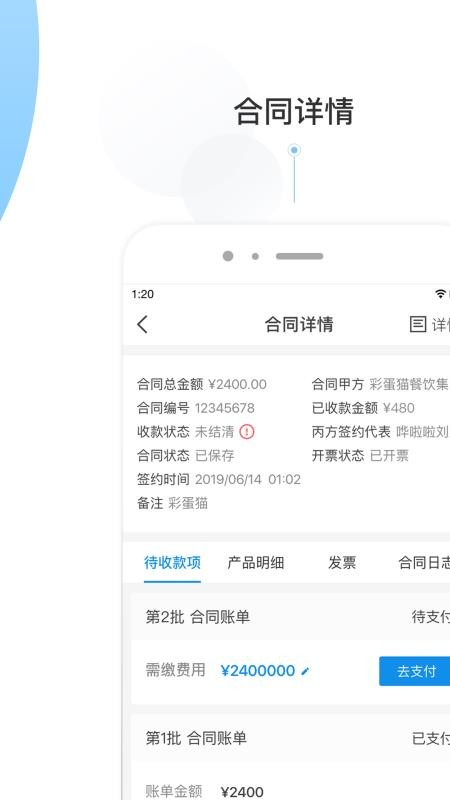 3、进入合同详情,查看合同待收款项信息,快速支付合同费用,了解合同日志详情