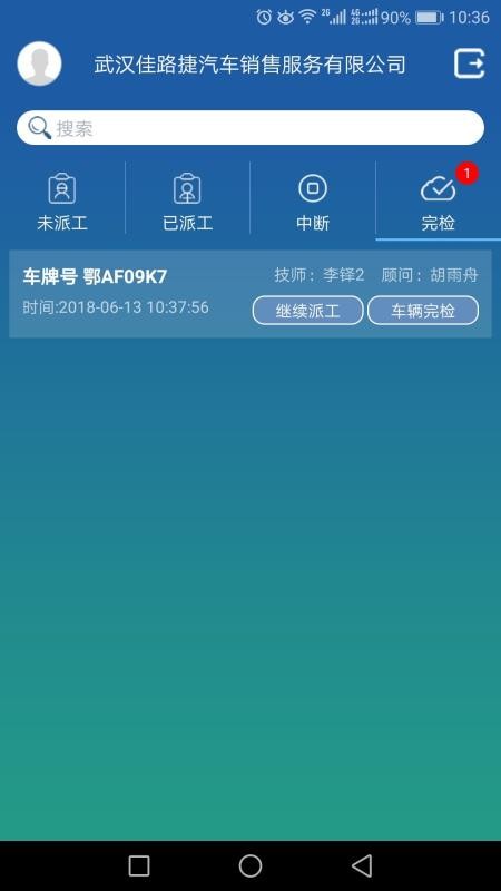 3、拥有继续派工功能,用户可以为完检的车辆继续进行派工,进行更细致的检查;