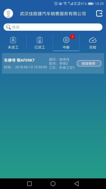 1、为用户提供中断版块,让用户看到各个维修中断的车辆信息,继续进行维修;