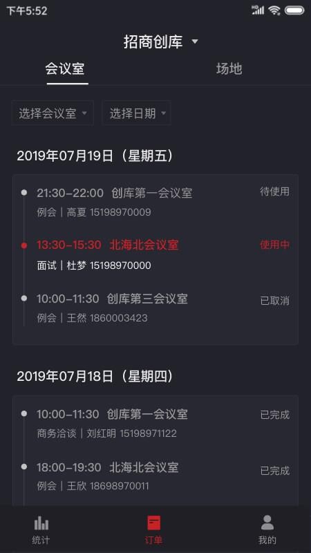 6、拥有订单版块,用户在这里能够看到各种订单信息,了解会议室和场地使用情况;