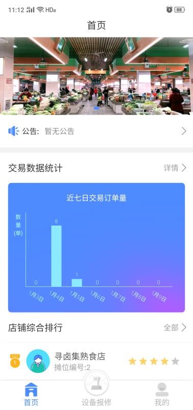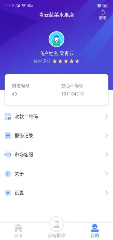 5、打开个人中心,查看自己的摊位编号和放心秤编号信息,了解自己的设备报修情况