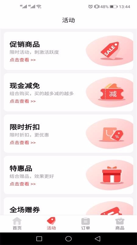 4、提供丰富的活动模板,活动中心为用户提供了促销商品、现金减免以及限时折扣多种活动;