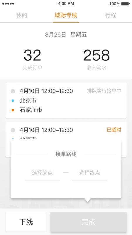 5、应用中会为用户显示自己当日完成订单数量和收入流水金额信息,方便用户了解;