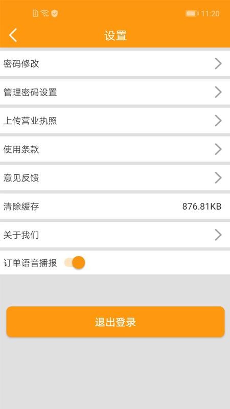 5、打开设置版块,一键修改自己的密码,快速上传营业执照,开启订单语音播报功能