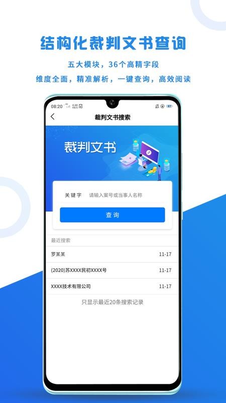6、提供裁判文书版块,用户在这里能够通过案号和当事人名称来搜索文书信息;