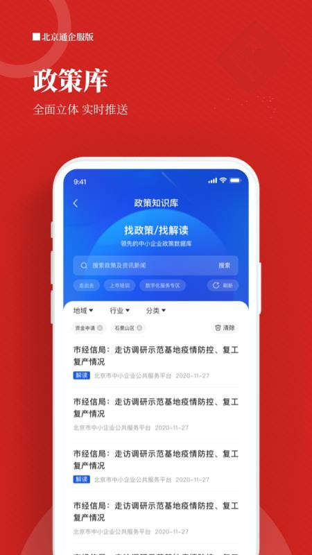 北京通企服版app是一款为各个企业提供服务的软件,让企业能够看到各种涉企政策,体验到全面的企业服务;在应用中用户可以看到各种类型的政策信息,更全面的了解更多的涉企政策,从而能够更轻松的经营自己的企业,及时领取政策福利和补贴;用户通过软件还可以找到各种申报和征集内容,快速的进行线上或线下申报,满足不同用户需求;用户还可以在这里找到多种类型的企业服务,帮助企业更加便捷的进行管理,让企业能够快速发展,提高企业规模;快下载这款软件试试吧,快速了解更多的涉企政策内容,在线办理各种业务。
